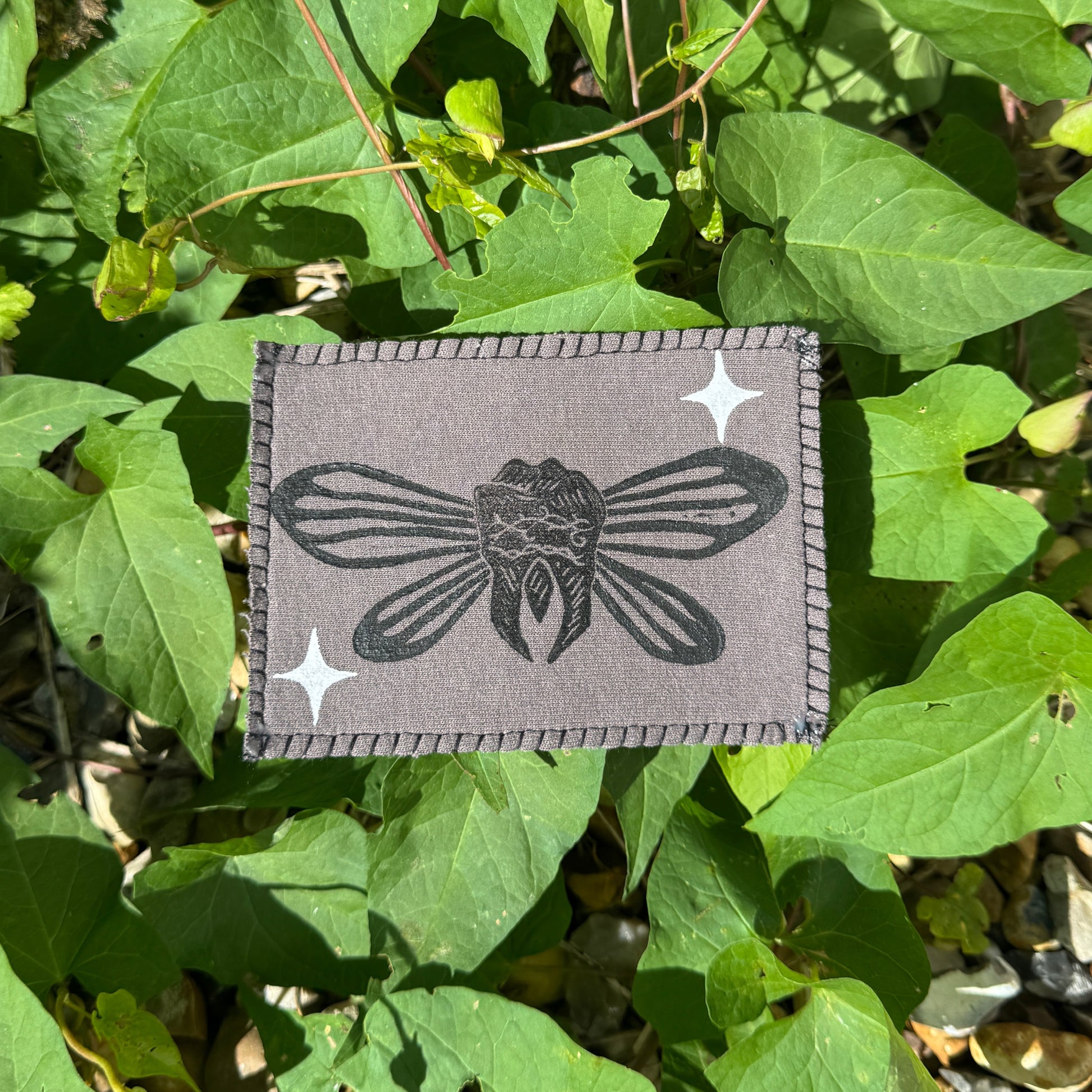 All of my patches have been hand printed by myself and are made using discarded fabric scraps! Each patch can be attached with either fabric glue or by machine sewing / sewing by hand!