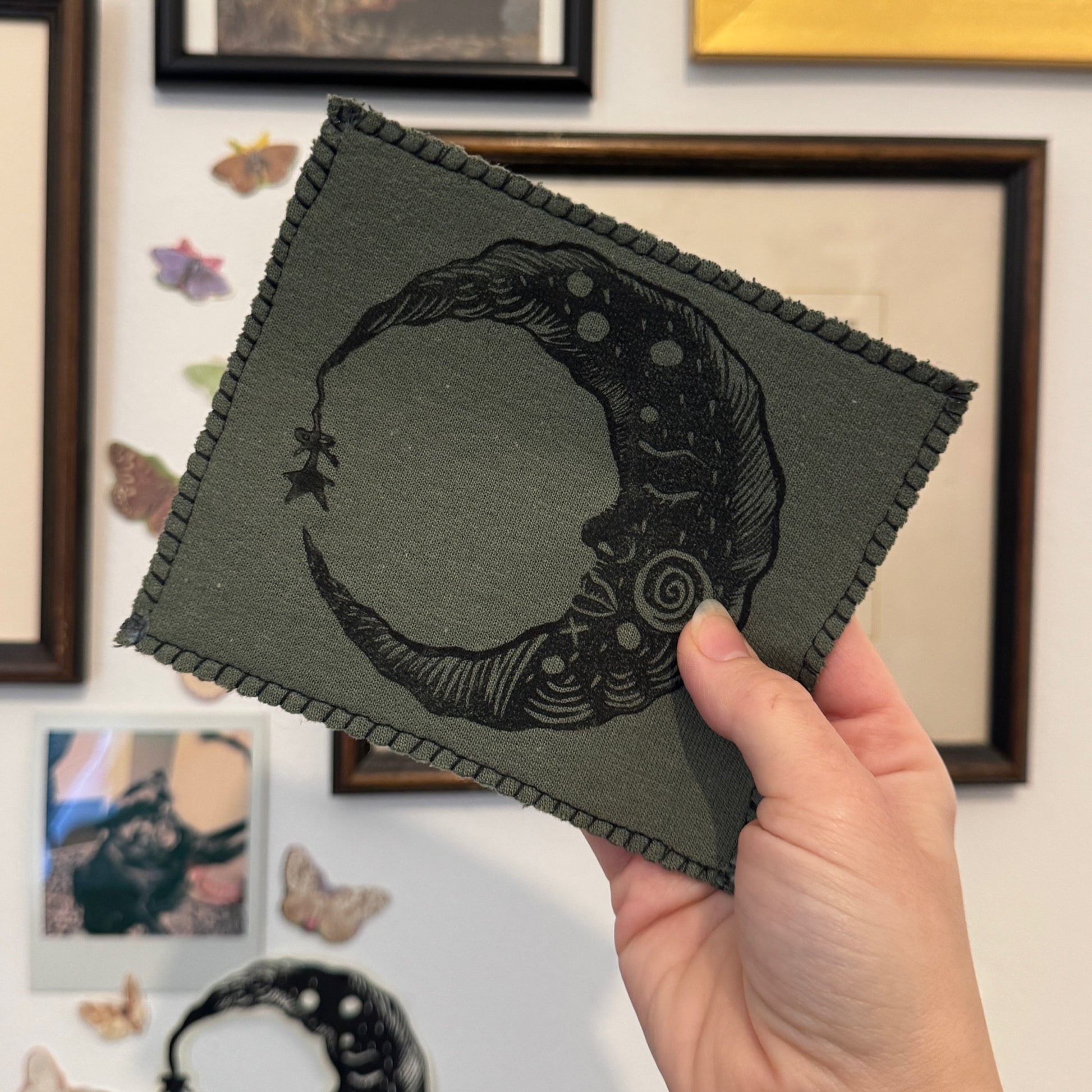 All of my patches have been hand printed by myself and are made using discarded fabric scraps! Each patch can be attached with either fabric glue or by machine sewing / sewing by hand!