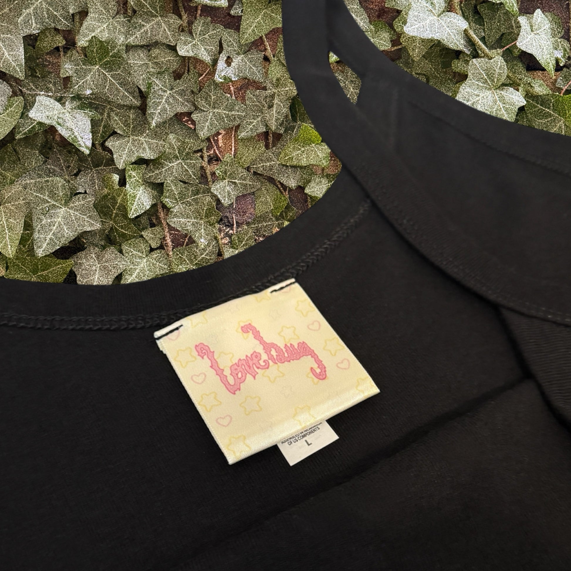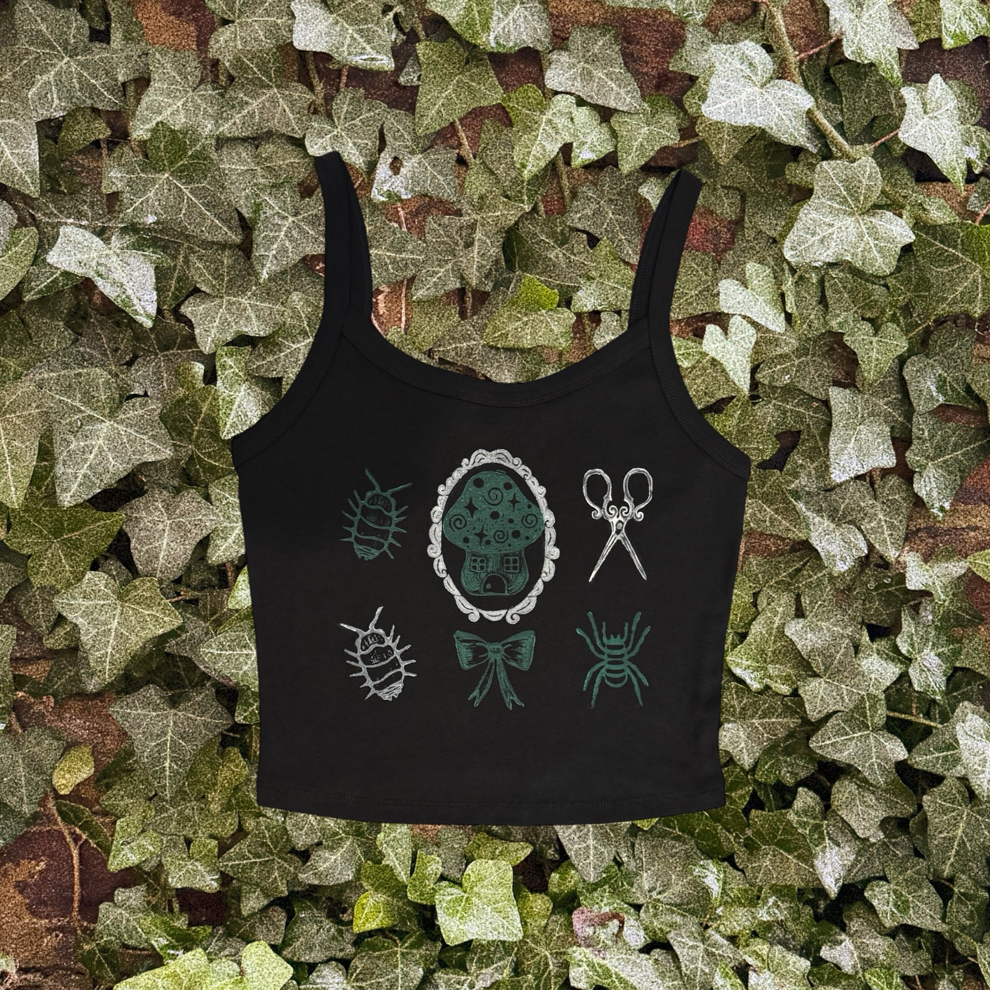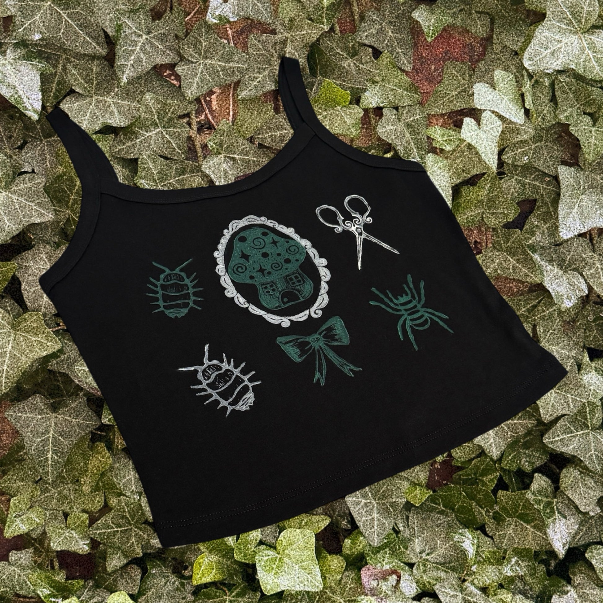 Hand printed black pre shrunk micro rib cropped tank top with a cute fairy house design.