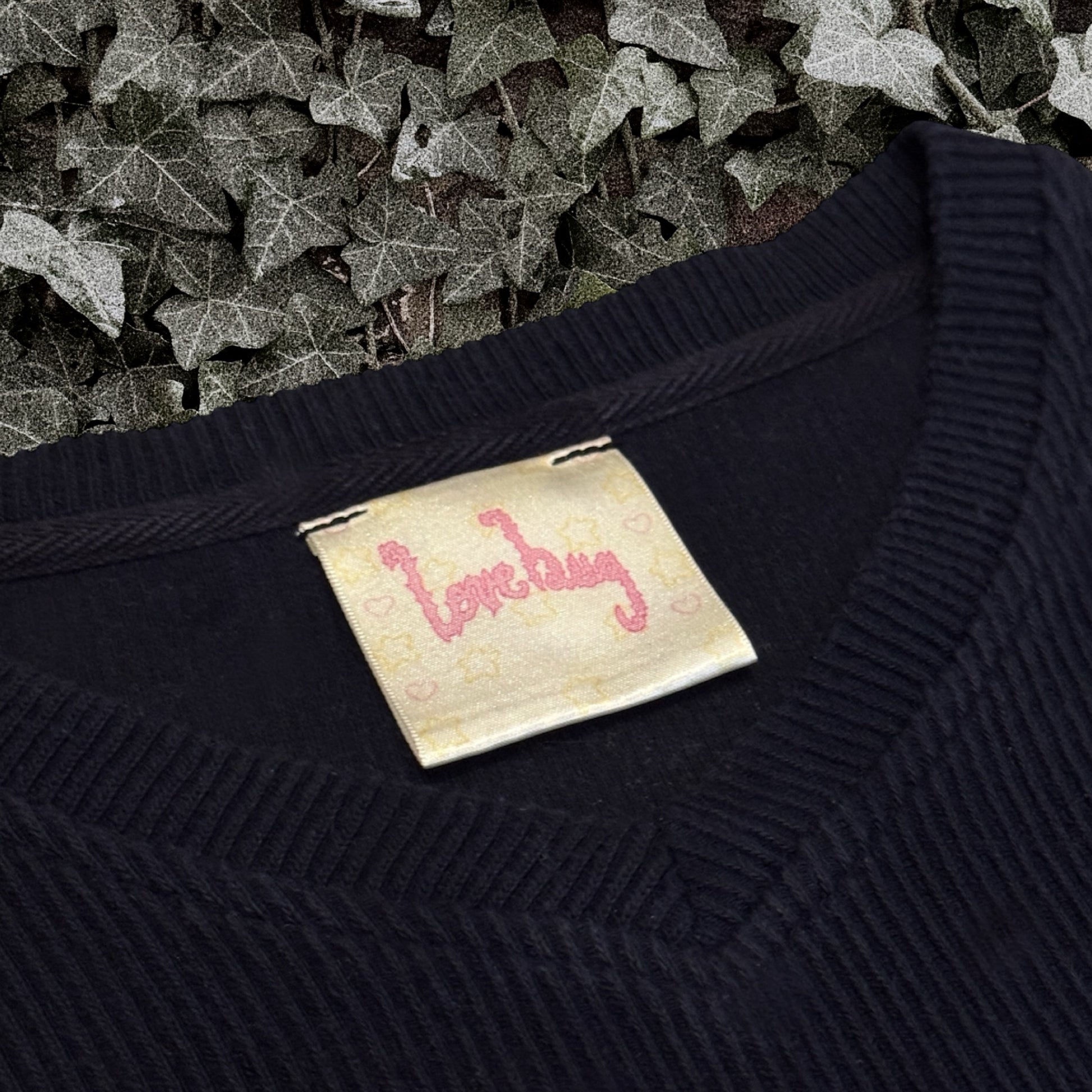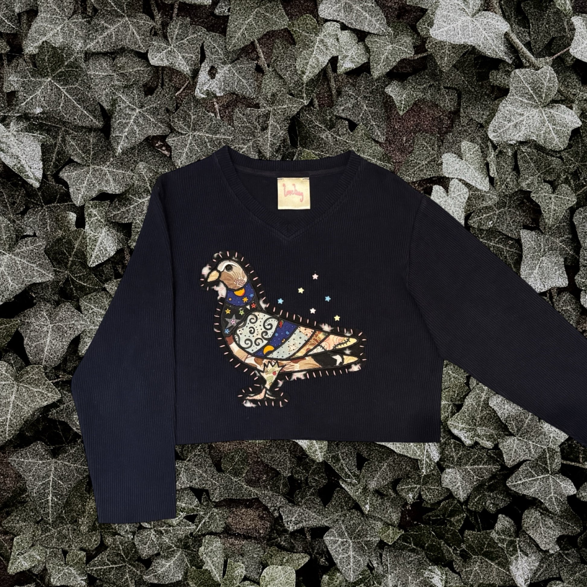 Reworked one of a kind navy blue fine knit jumper with a patchwork pigeon design!