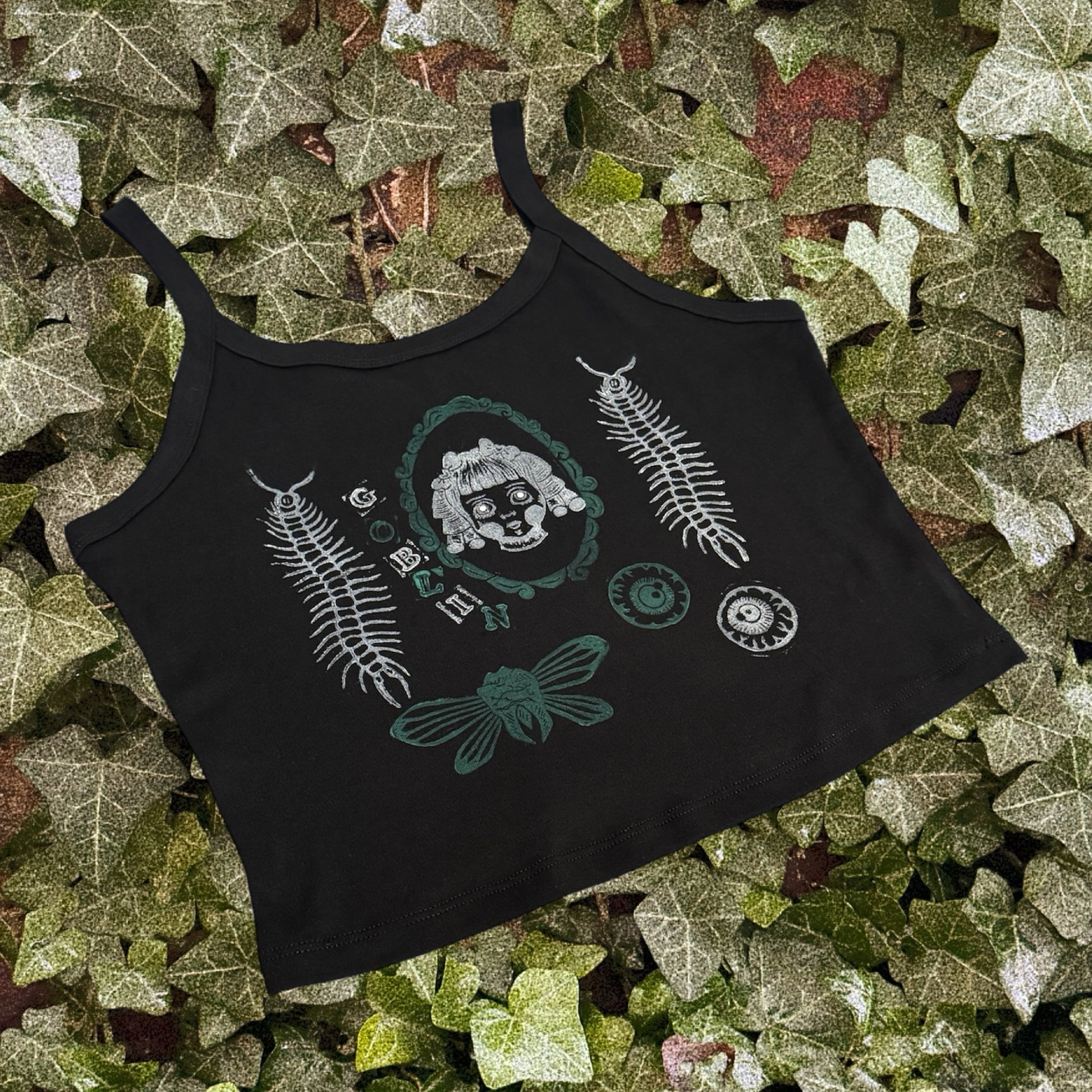 Hand printed black pre shrunk micro rib cropped tank top with a cute doll & bug design.