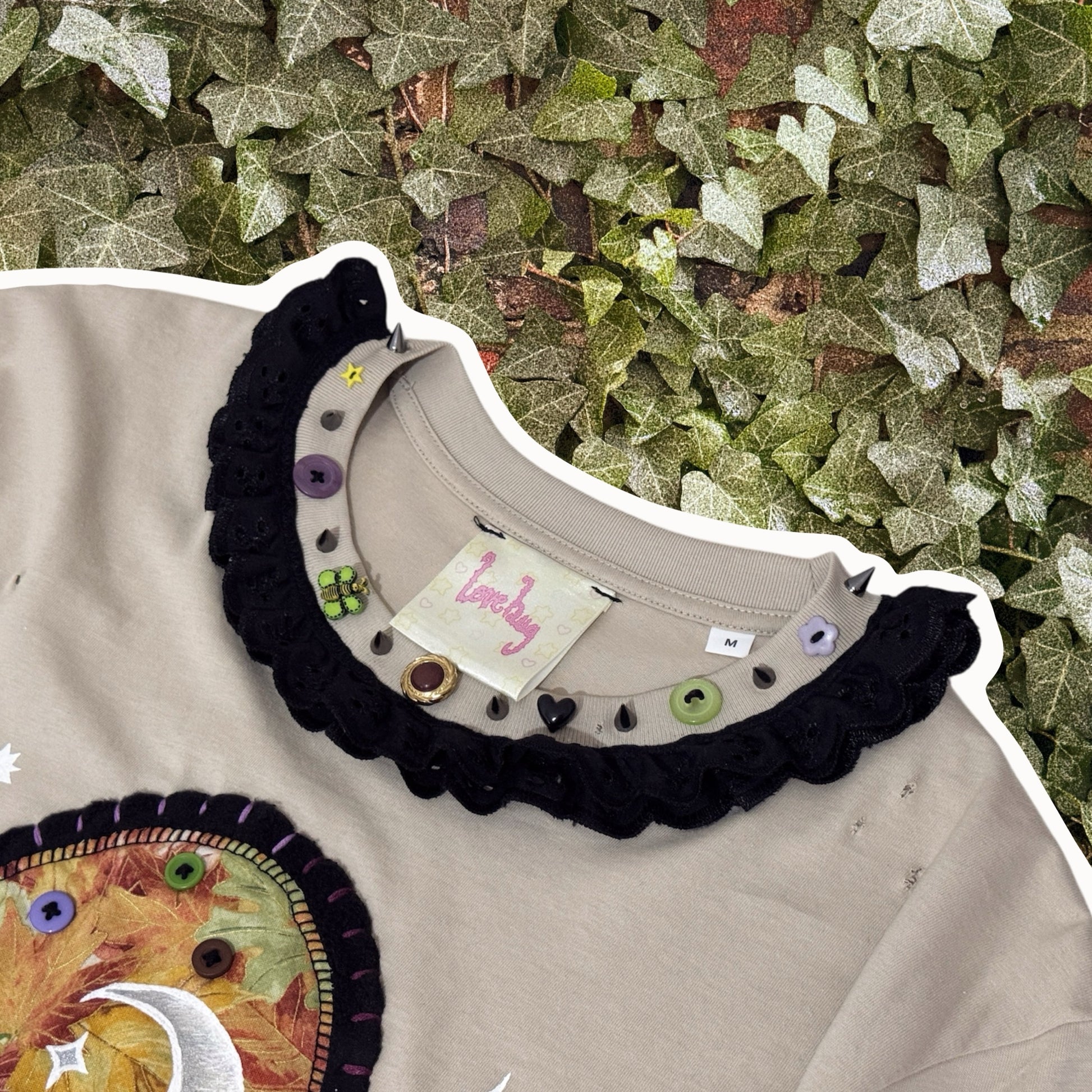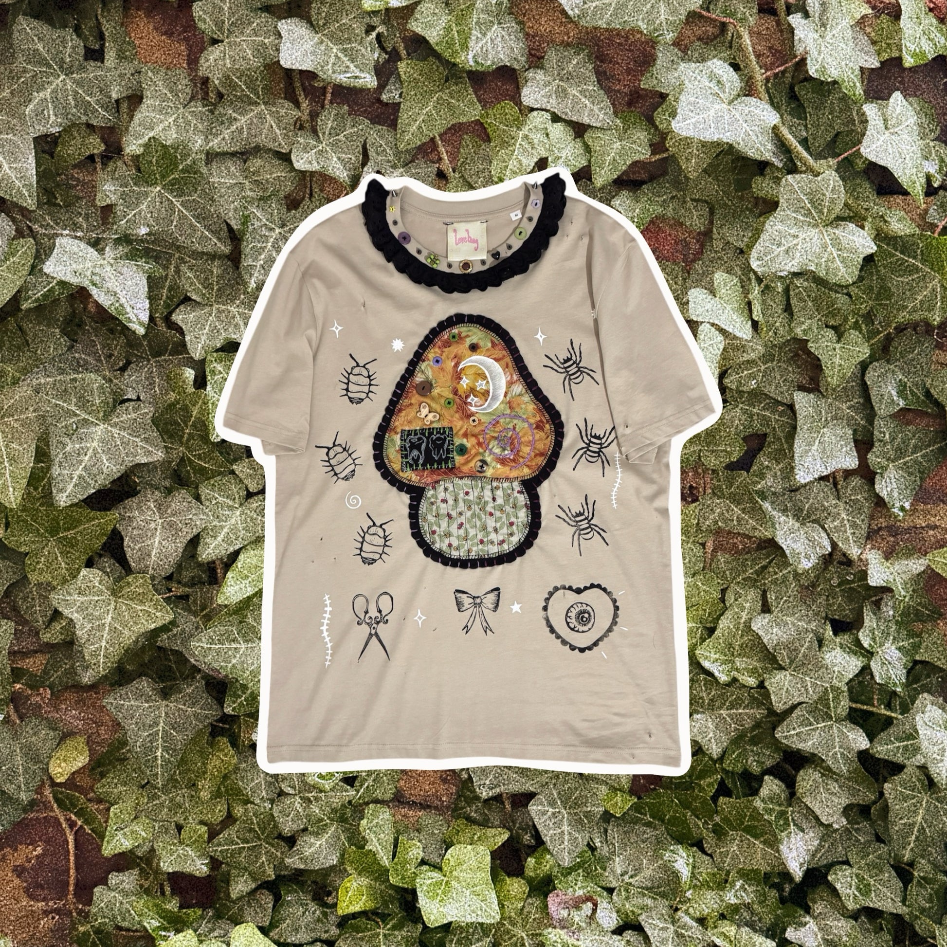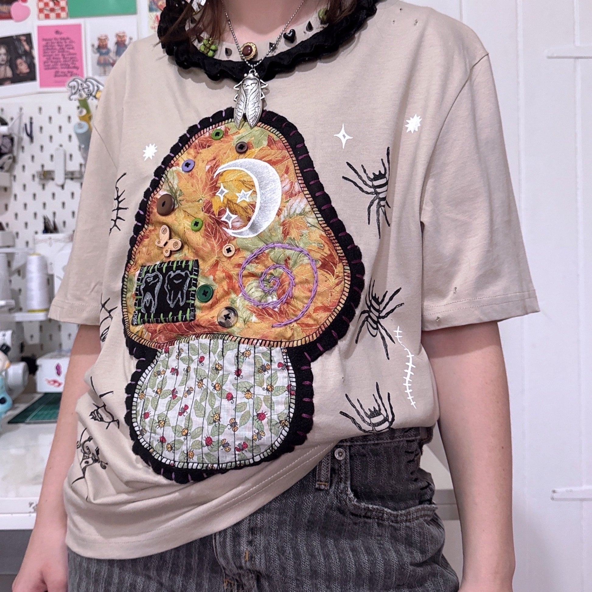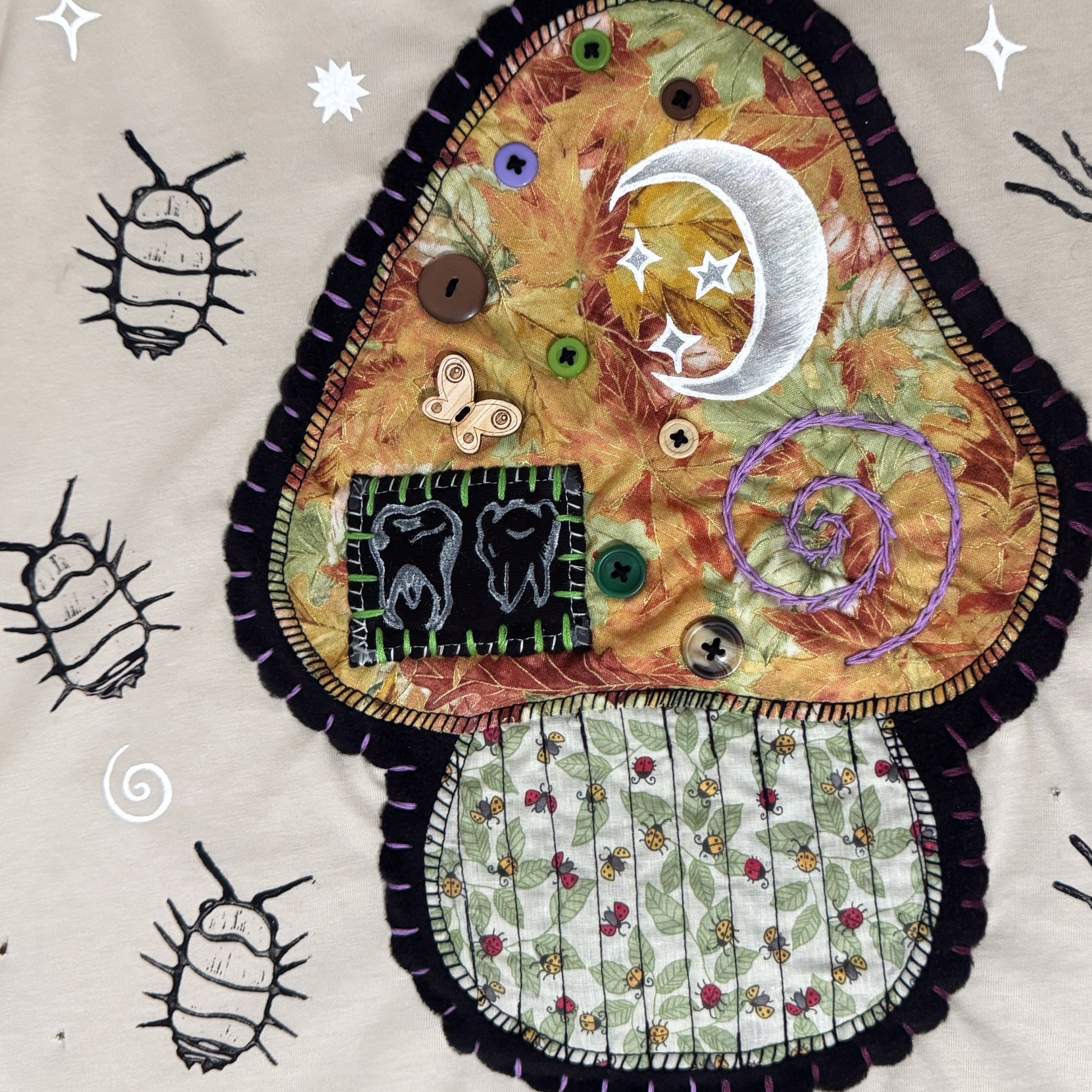 Handmade mushroom appliqué that has been made from vintage secondhand fabric