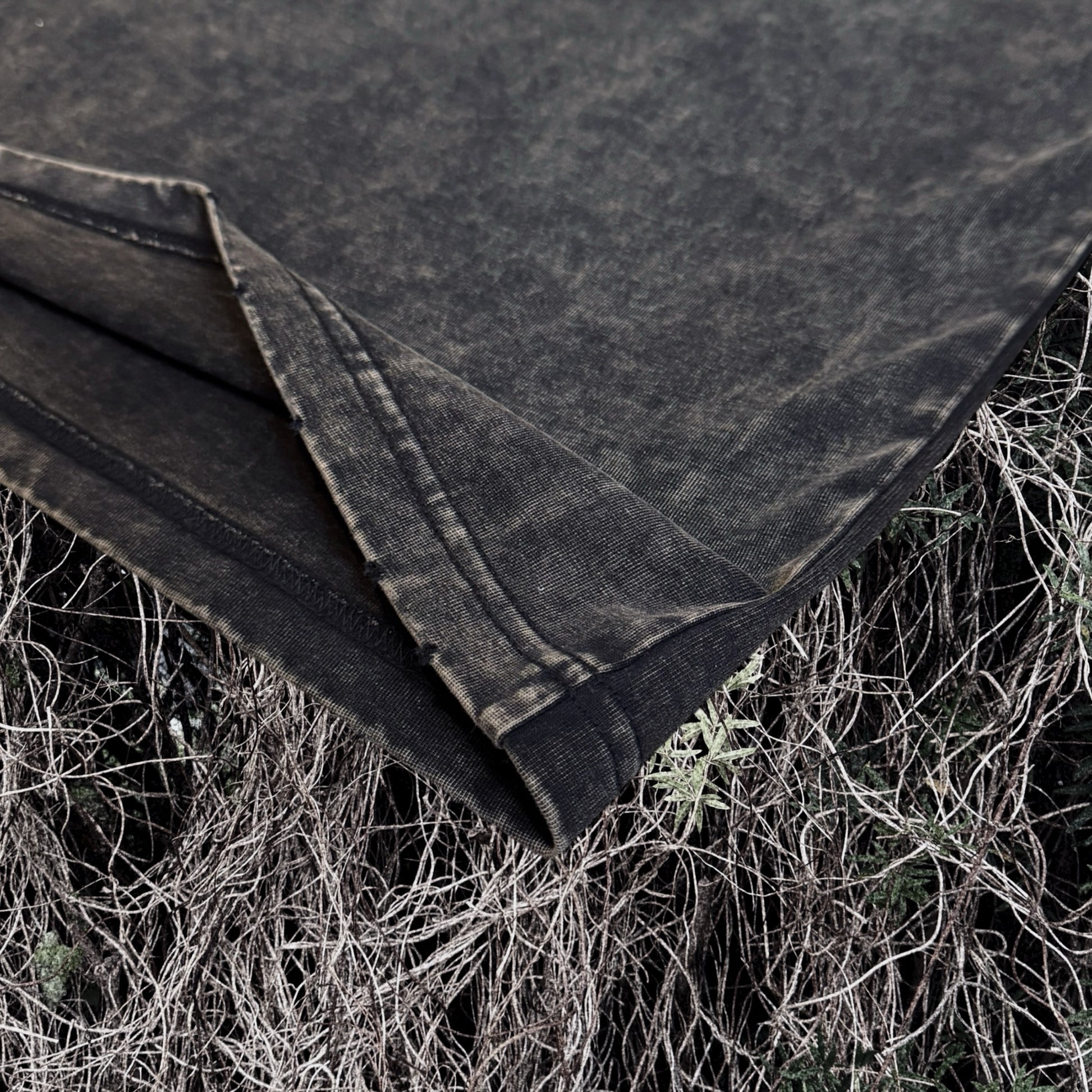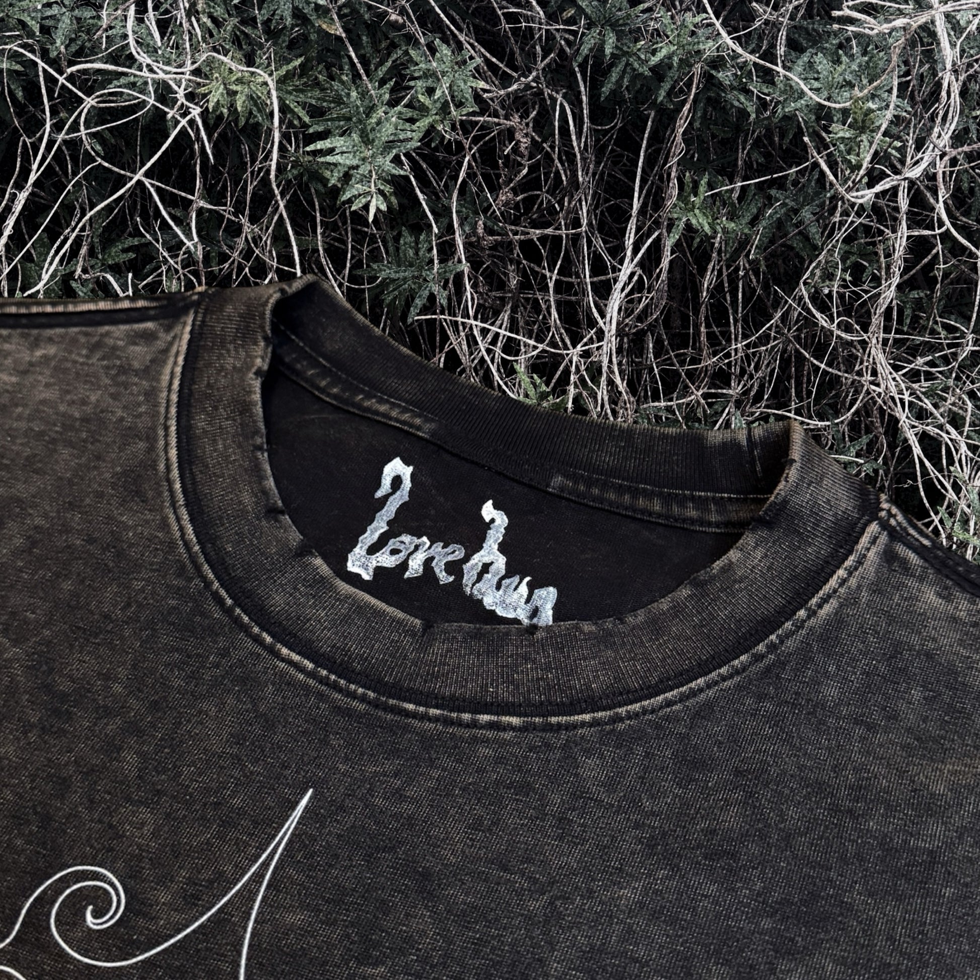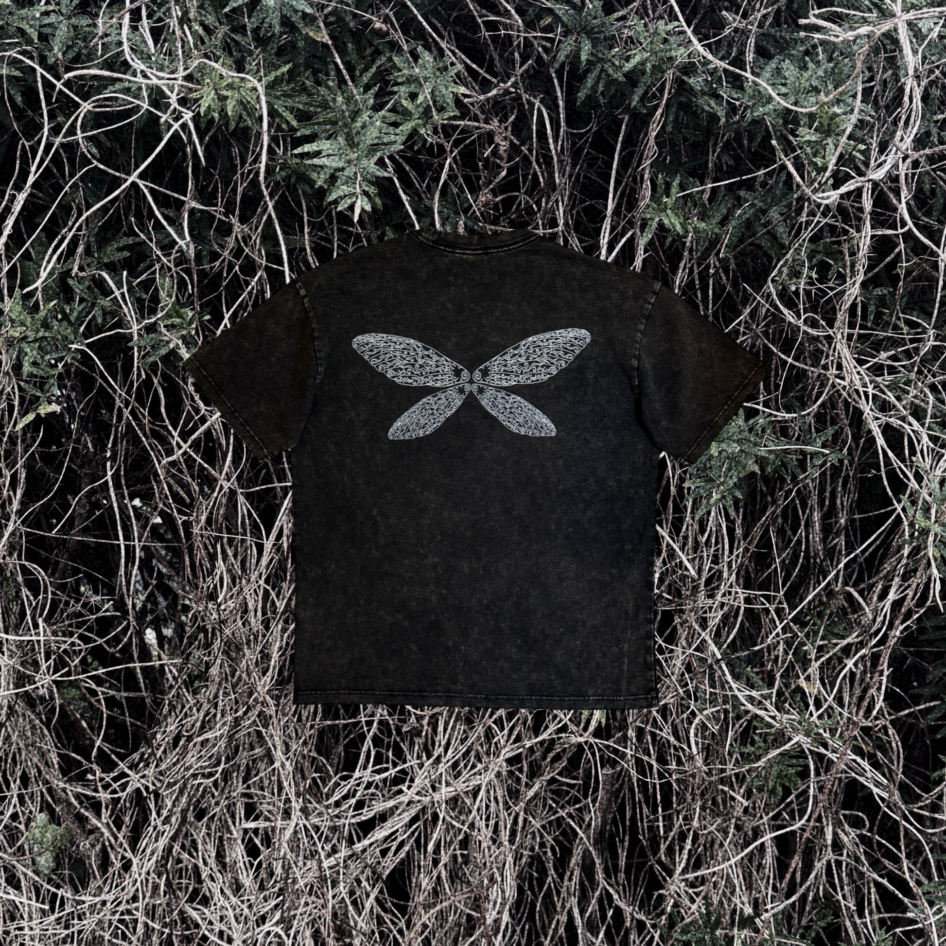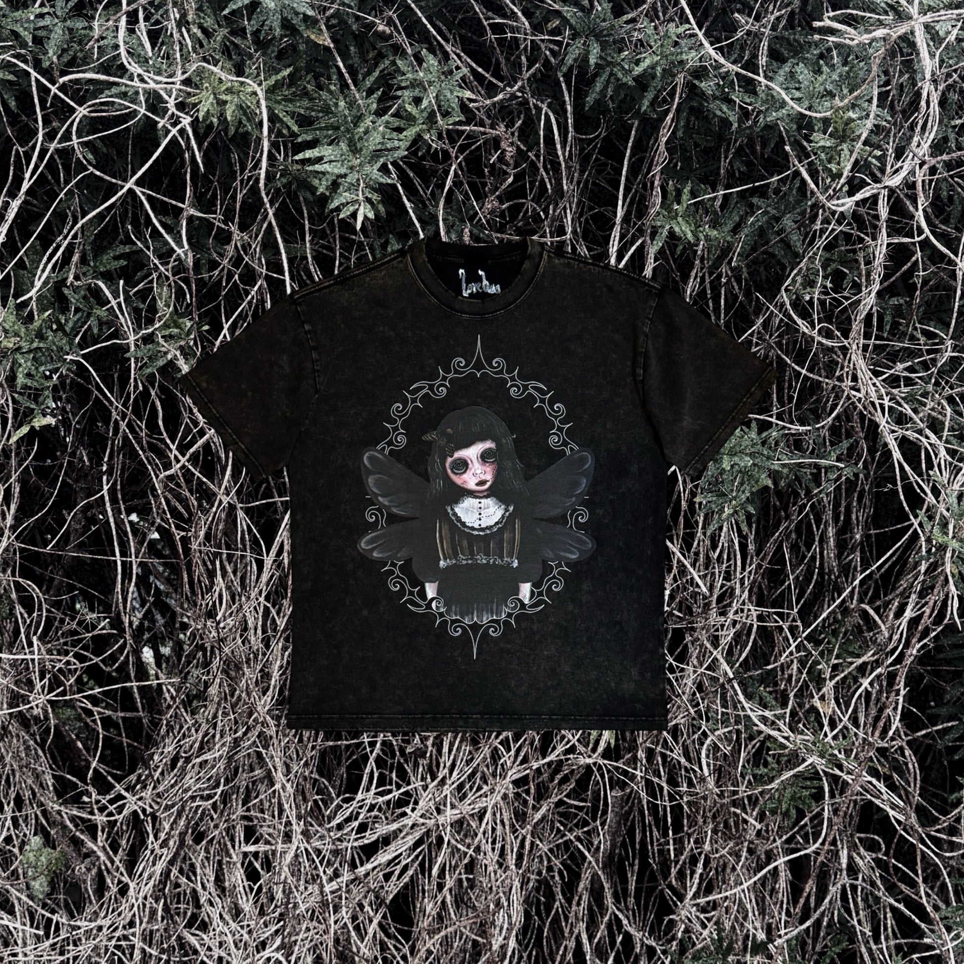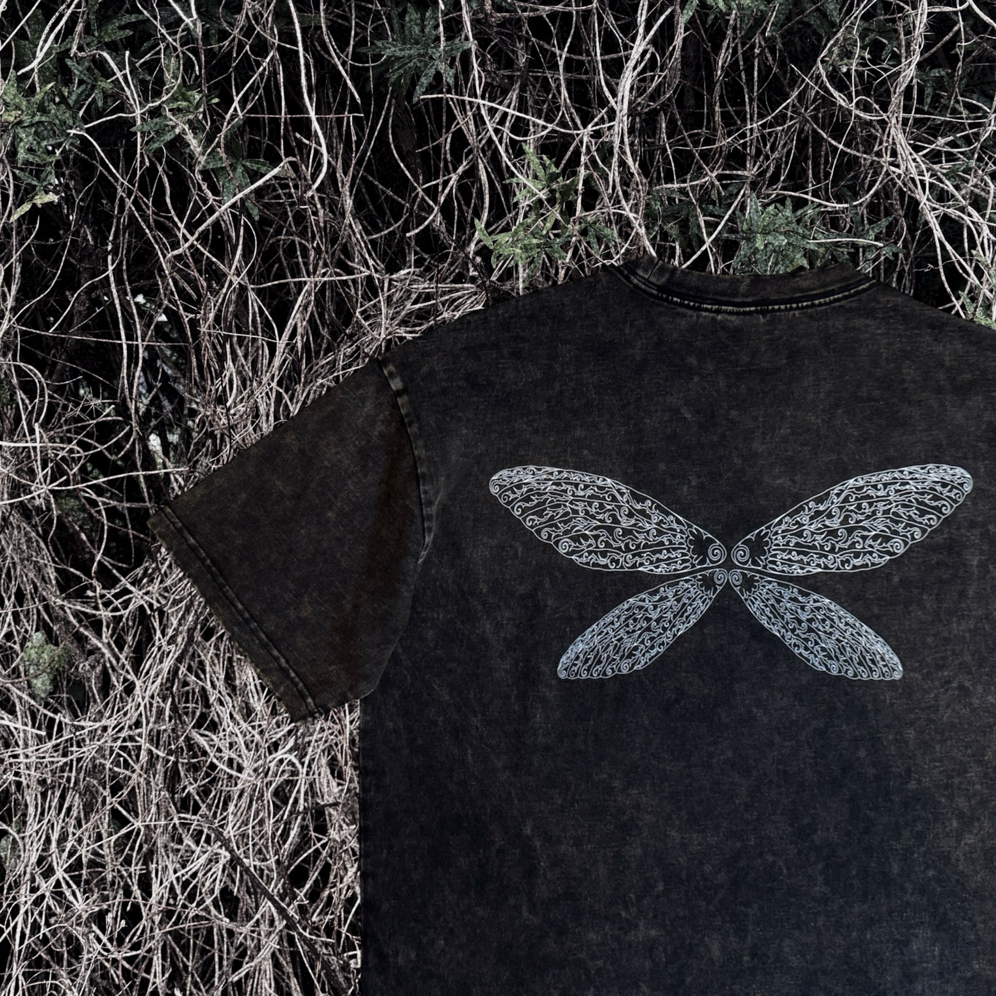 Black drop shoulder short sleeved acid wash t-shirt featuring original art work by me on the front complete with some fairy wings on the back!