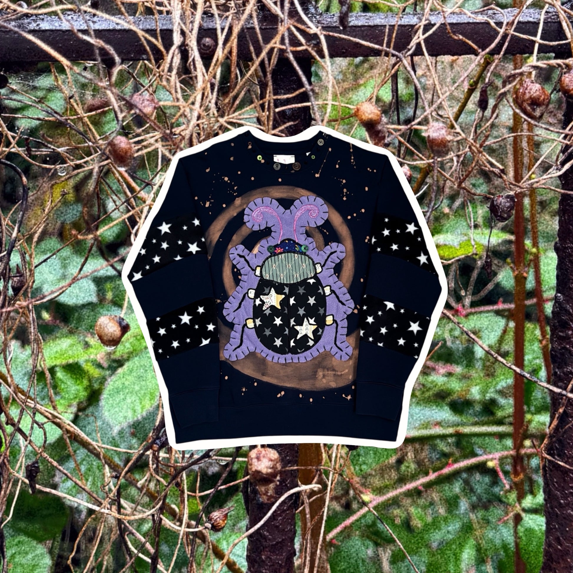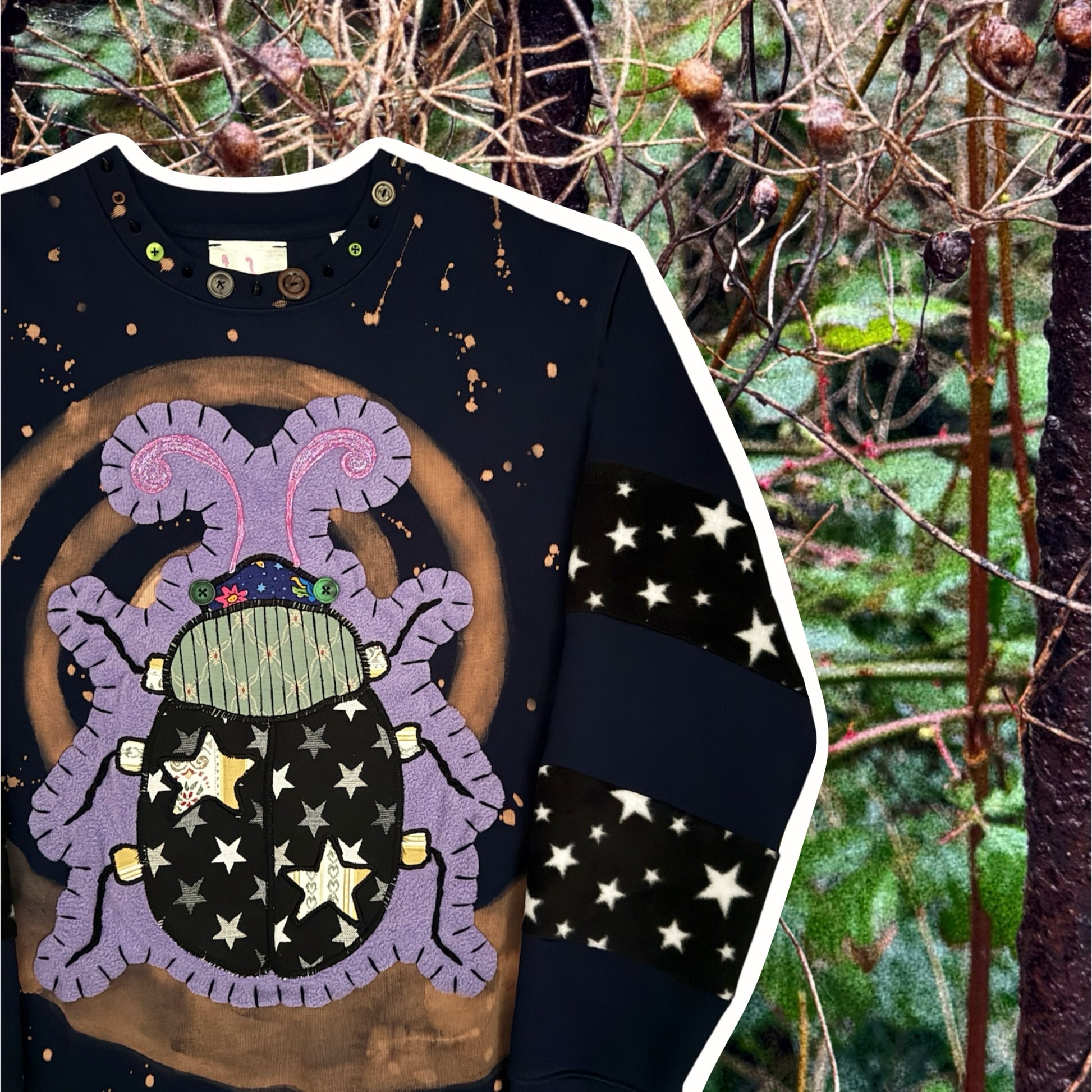 Handmade beetle appliqué that has been made from vintage secondhand fabric