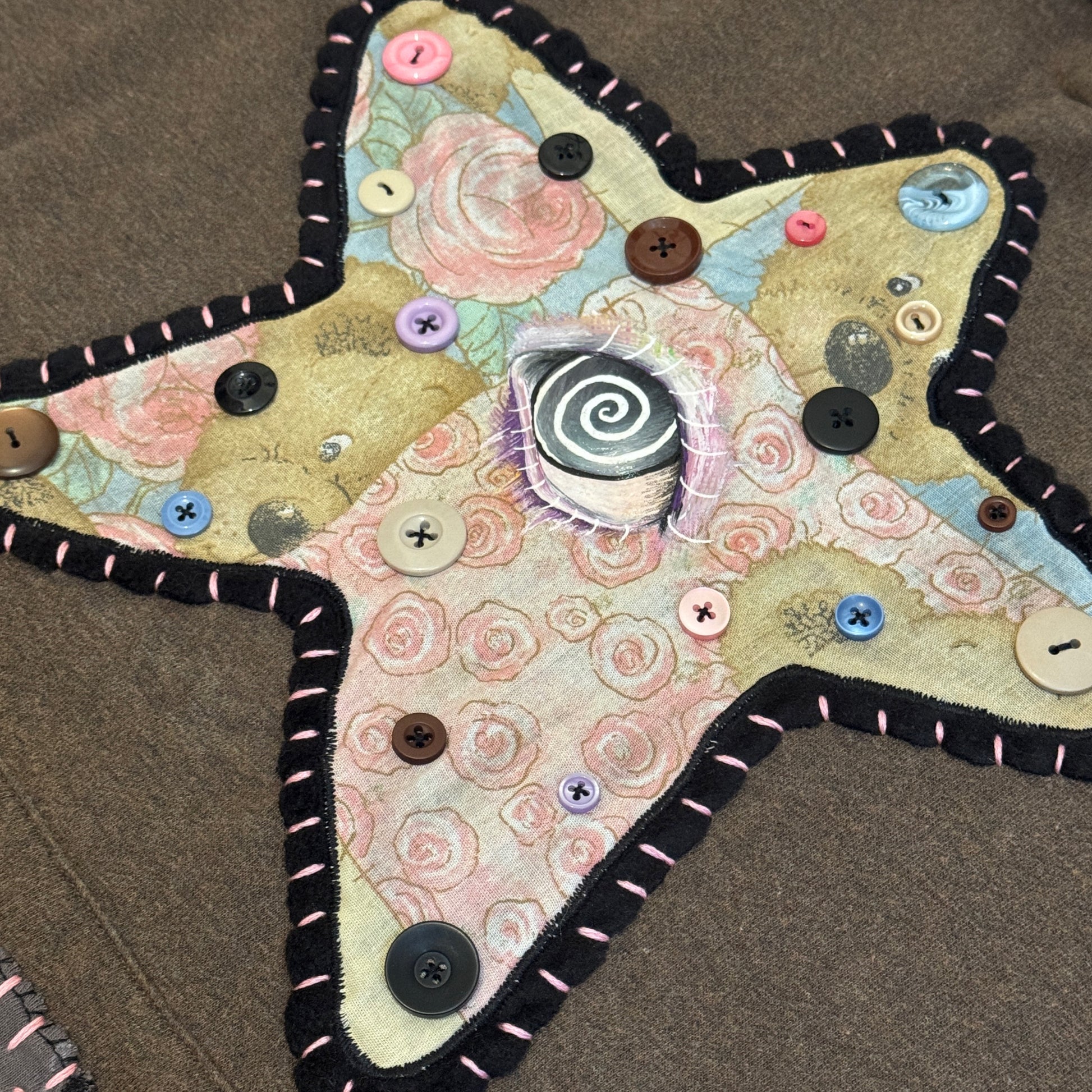 - Handmade star appliqué that has been made from secondhand vintage fabric with a hand painted eye design in the middle