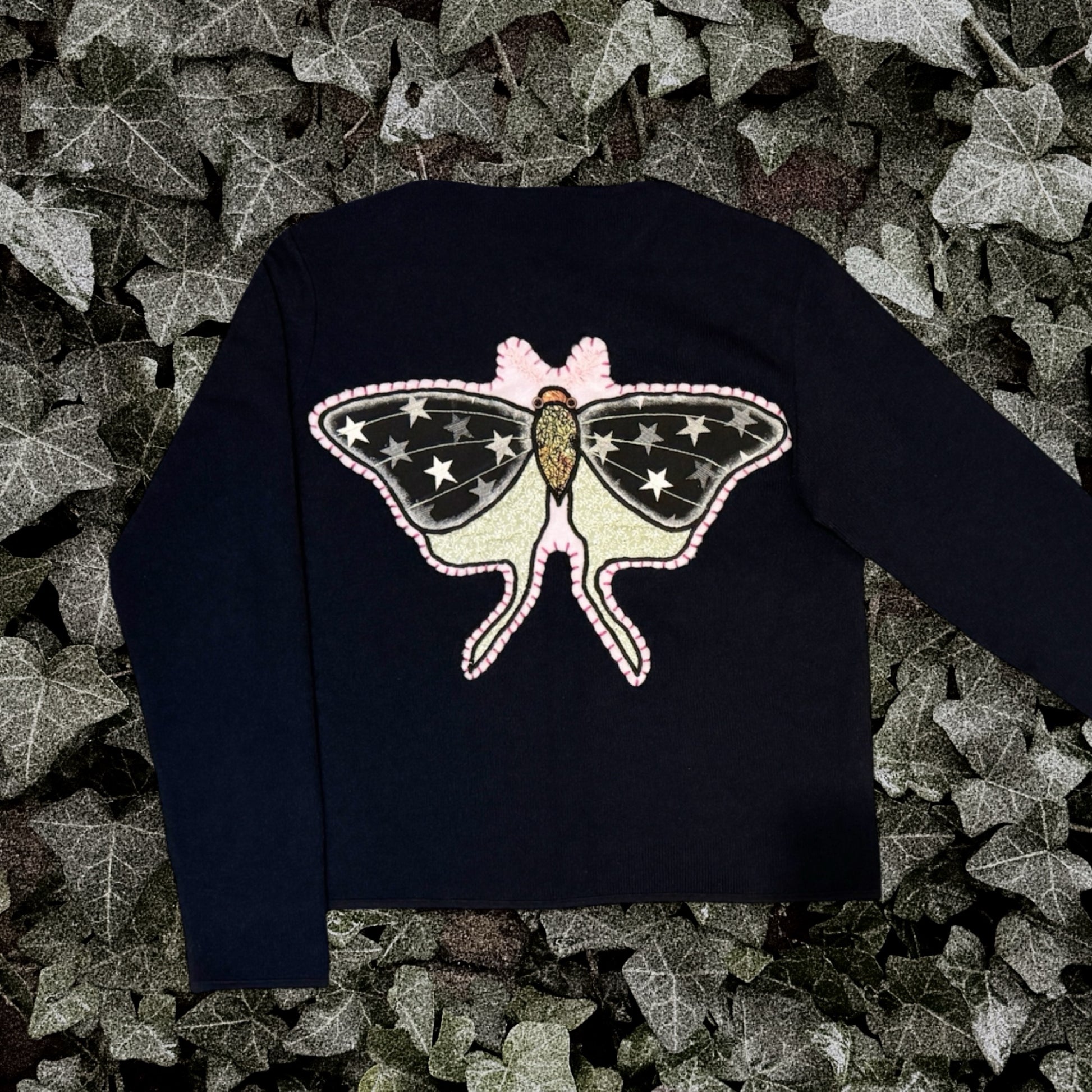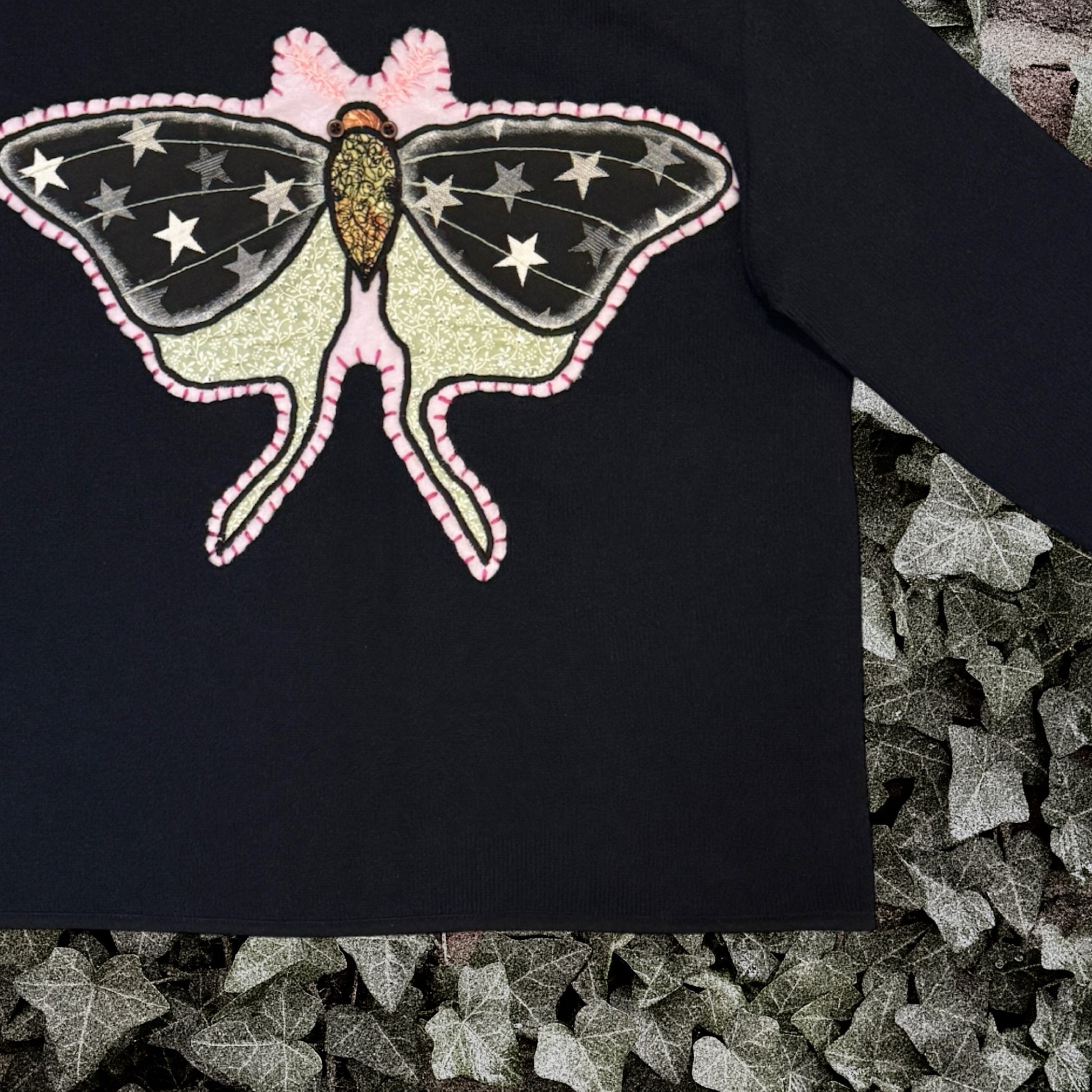 - Handmade moth appliqué made from vintage secondhand fabric with diamanté and glitter paint on the wings
