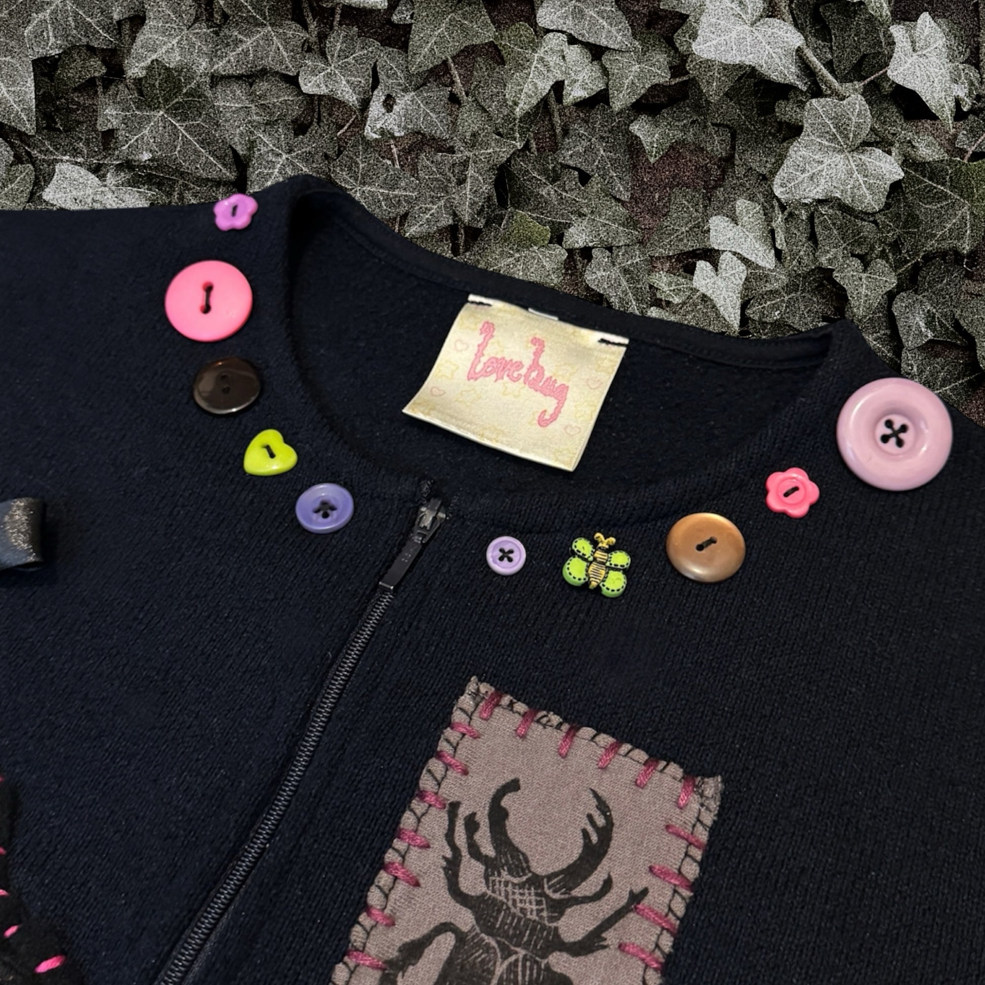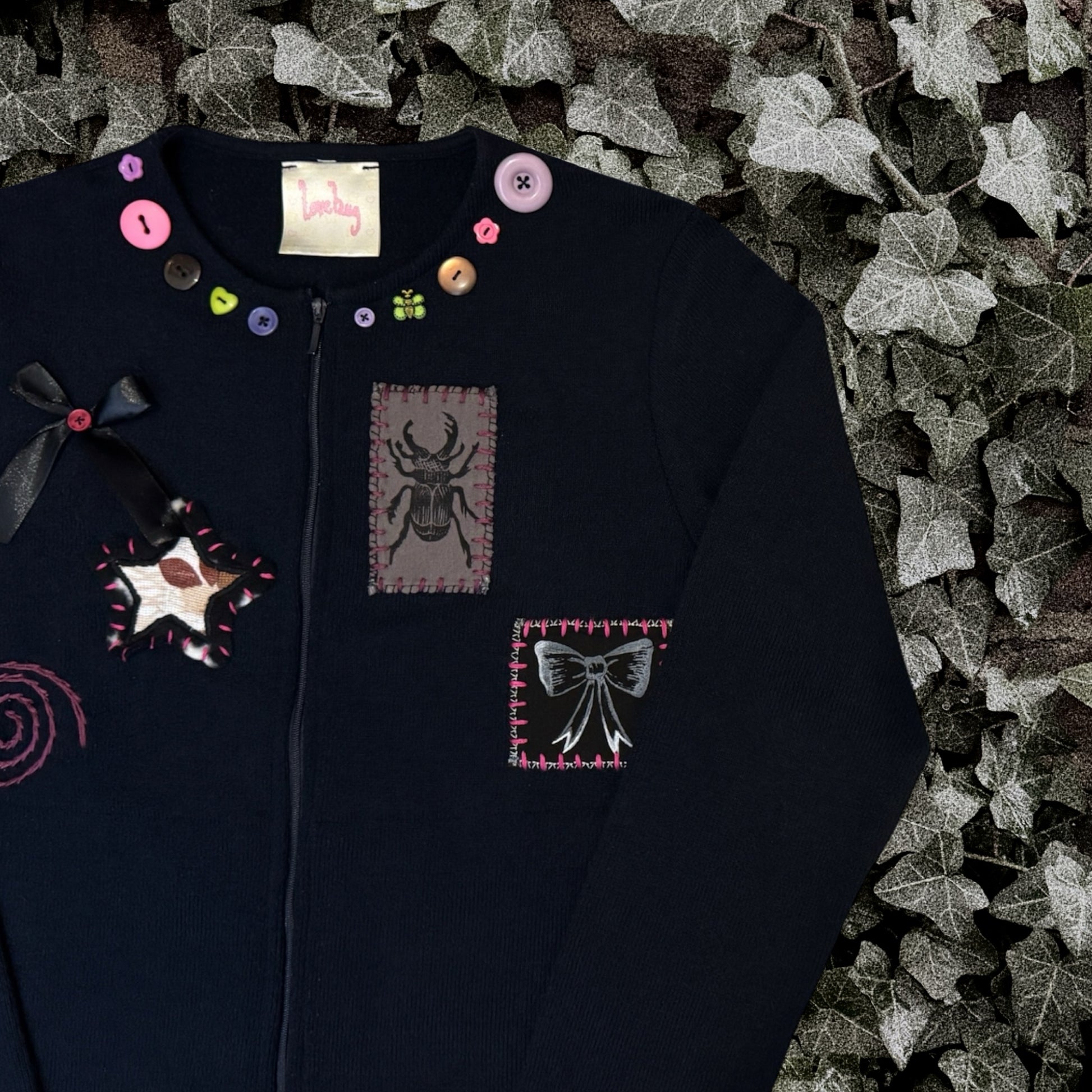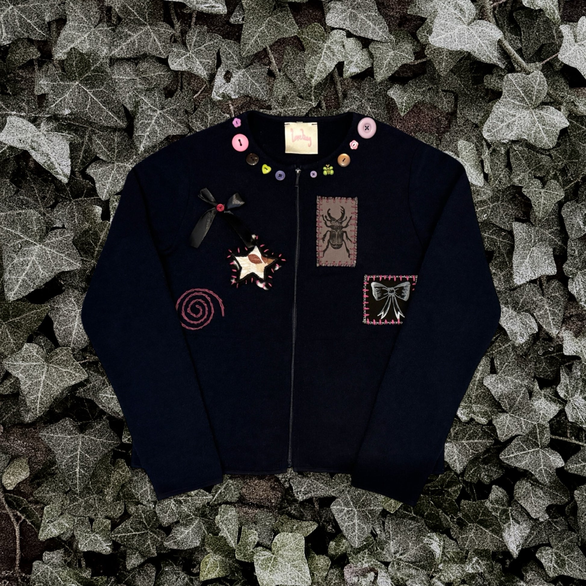 Reworked one of a kind navy blue zip up fleece cardigan with a cute patchwork design on the front & moth appliqué on the back!