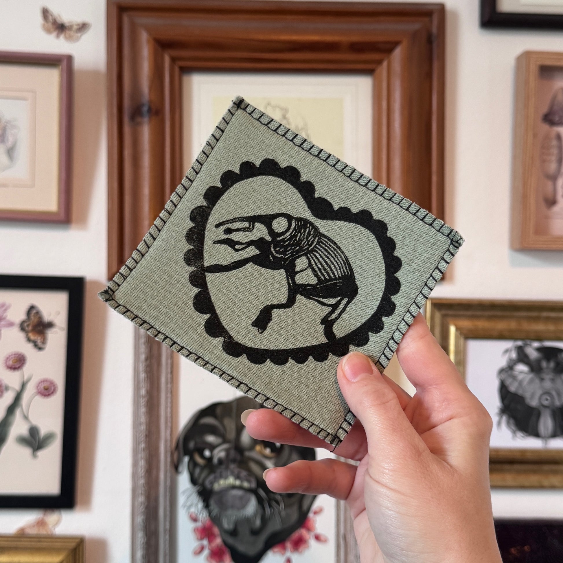 All of my patches have been hand printed by myself and are made using discarded fabric scraps! Each patch can be attached with either fabric glue or by machine sewing / sewing by hand!